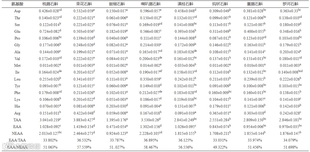 Table 5. Amino acid composition and content in 8 species of Dendrobium plants (g/100 g)