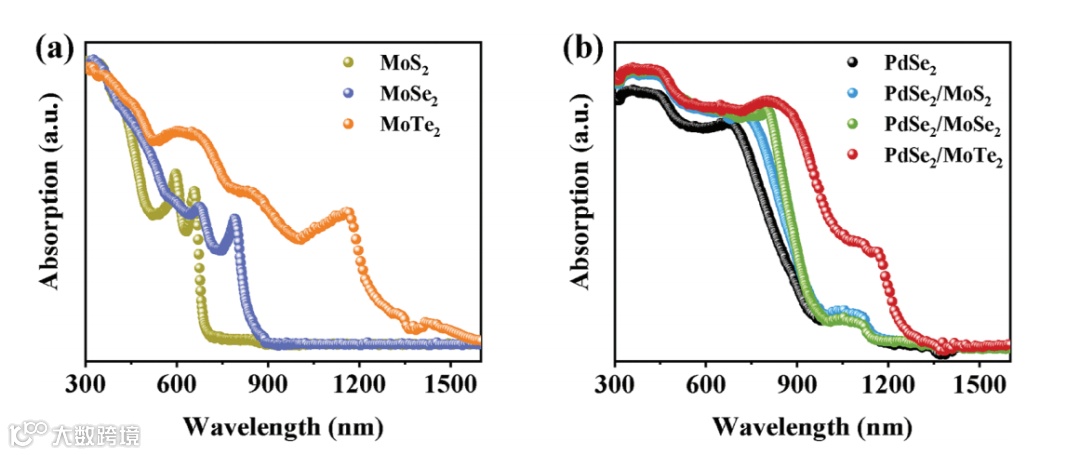 图2. a)MoS2、MoSe2和MoTe2的吸收光谱; b)PdSe2、PdSe2/MoS2、PdSe2/MoSe2和PdSe2/MoTe2的吸收光谱