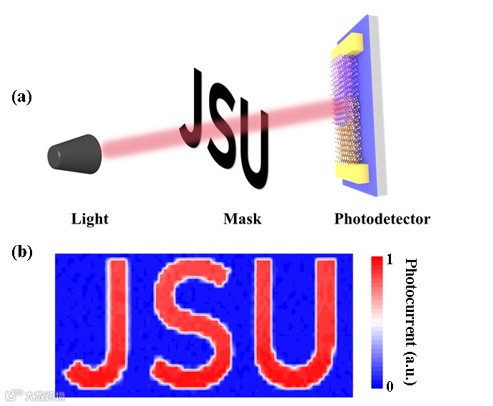 成像系统的示意图如图S17a(支持信息)所示,其中,一块掩模板(“JSU”)被放置在光源和器件之间。通过移动掩模板,我们收集每个像素对应的光电流和暗电流,然后将它们组合成一幅图像,以生成对比度映射图。图S17b展示了该器件在980nm光照下的成像效果。