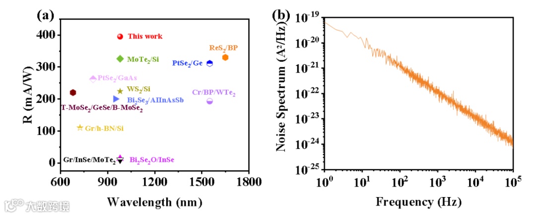 图S13 (a)文献报道的红外自供电光探测器的响应性与本工作的比较。(b)自供电模式下PdSe2/MoTe2器件的电流噪声密度谱。