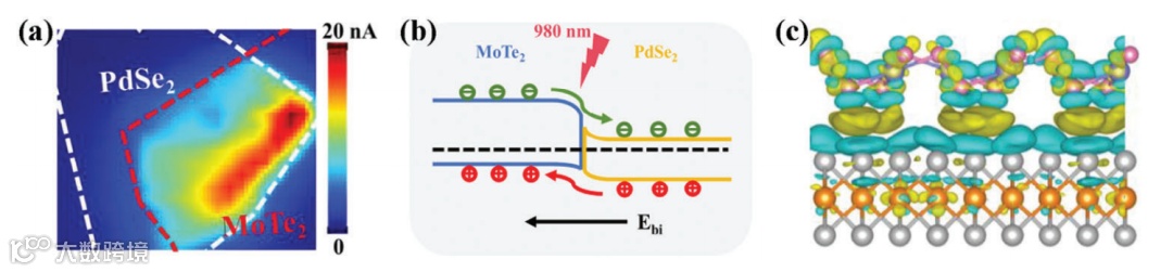 图7. a)在980nm光照下,器件在0V偏压时的扫描光电流分布图。b)在980nm光照下,器件在0V偏压时的能带图。c)异质结的差分电荷密度图,其中黄色和绿色区域分别代表正电荷和负电荷。