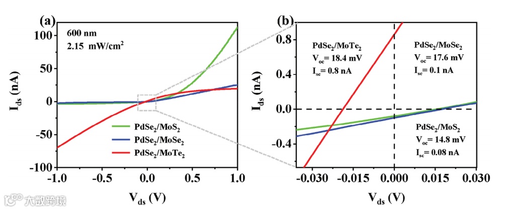 图5. a)在600 nm光照且功率密度为2.15 mWcm-2条件下,由PdSe2/MoS2、PdSe2/MoSe2和PdSe2/MoTe2制成的器件的源漏电流--源漏电压(Ids-Vds)曲线。b)为a)中≈0V处的Ids-Vds曲线放大图。