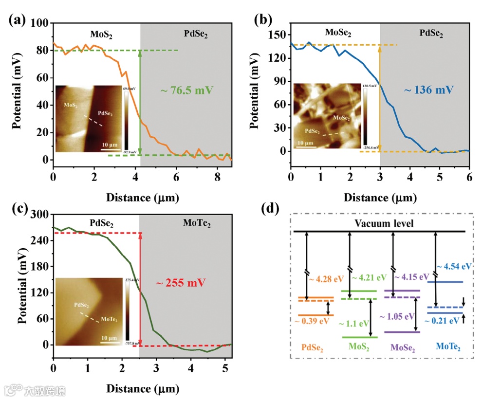 图3. 范德华异质结构的功函数差异与能带排列。a-c)PdSe2/MoS2、PdSe2/MoSe2和PdSe2/MoTe2的表面电势分布图。插图:各异质结构的开尔文探针力显微镜图像,其中白线表示测试路径。d)PdSe2/MoS2、PdSe2/MoSe2和PdSe2/MoTe2三种异质结构的能带排列示意图。