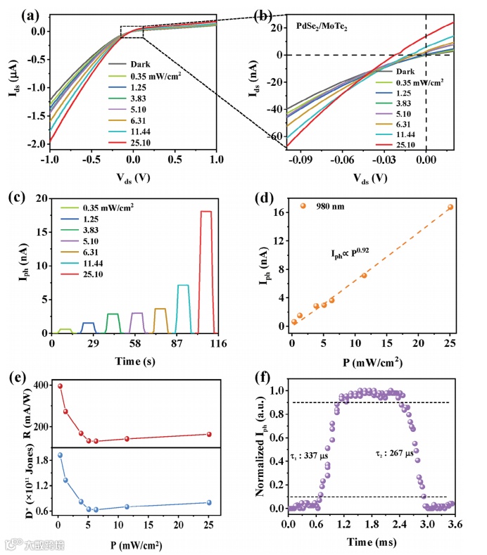 图6. PdSe2/MoTe2器件在980nm光照下的光响应特性。a)不同功率密度(P)下器件的源漏电流-源漏电压(Ids-Vds)曲线。b)(a)中0V偏压附近的Ids-Vds曲线放大图。c)0V偏压下不同功率密度(P)时器件的光电流-时间(Iph-T)曲线。d)0V偏压下光电流(Iph)与功率密度(P)的关系图。e)0V偏压下器件的响应度(R)和探测率(D*)曲线。f)980nm光照下PdSe2/MoTe2器件在自供能模式下的响应时间。