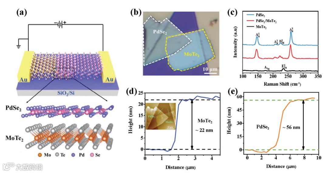 图1. a)由异质结构PdSe2/MoTe2和电极制成的光电探测器的示意图; b)异质结构PdSe2/MoTe2的光学图像; c)PdSe2、PdSe2/MoTe2和MoTe2的拉曼光谱; d,e)异质结构中MoTe2和PdSe2的AFM台阶高度分布