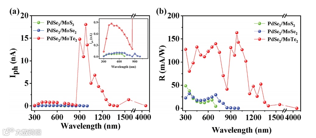 图4. 异质结器件PdSe/MoX2(X=S、Se和Te)的光响应随光波长的变化。a)异质结器件中的光电流(Iph)。b)异质结器件的响应度(R)。