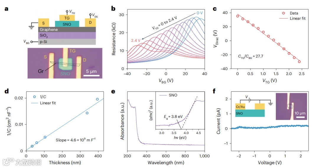 图2 SNO的介电特性。a ,SiO2 /p 型 Si (p-Si) 基板上具有 SNO 顶栅电介质的双栅极石墨烯 (Gr) FET 的示意图和光学图像。S、D和TG分别是源极、漏极和顶栅。b,典型双栅极石墨烯 FET 的总电阻作为不同V TG 下 V BG的函数。V DS = 1 mV。c,石墨烯 FET 的背栅狄拉克点电压与V TG的关系。d,SNO 的厚度相关电容。e,SNO的紫外-可见吸收光谱。插图:相应的 Tauc 图,显示 SNO 的光学带隙 ( E g )。α、h和ν分别是吸收系数、普朗克常数和光子频率。f,典型 SNO 纳米片的I – V特性( t = 3.5 nm)。插图:相应设备的示意图(左)和光学图像(右)。