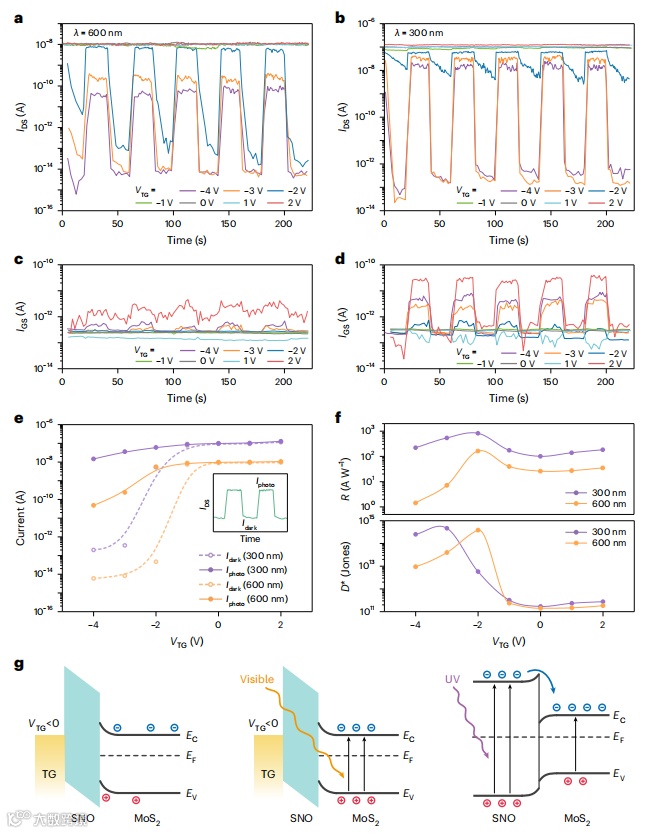 图4 具有 SNO 顶栅电介质的双栅 MoS2光电晶体管的光响应。a、b ,在 600 nm ( a ) 和 300 nm ( b ) 光开/关切换周期期间,器件在不同V TG下的时间分辨I DS曲线。V DS为 0.1 V。c、d是器件在600 nm ( c ) 和 300 nm ( d ) 光开/关切换周期期间在不同V TG下的时间分辨I GS曲线。从a和b中提取的不同V TG下的光电晶体管的e、I dark和I photo。插图:在光开/关切换周期期间,时间分辨I DS曲线中的I dark和I photo示意图。f ,在不同V TG下 300 和 600 nm 光照射下器件的响应度(上图)和比探测率(下图)。g,双栅极MoS2光电晶体管在黑暗中V TG < 0(左图)、可见光照明(中图)和紫外光照明(右图)下的能带图。红色和蓝色圆圈分别代表空穴和电子。E F是费米能级。为了清楚起见,未示出背栅。