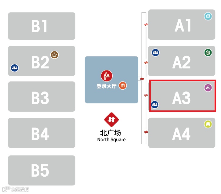 1、请由北广场/登录大厅进入A3区: