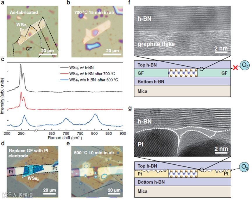 石墨片状电极也是高温保护时不可缺少的材料(图2)。如果只使用传统Pt电极,配合h-BN封装,WSe2在500℃高温时就会被严重氧化(图2c-e)。这是因为溅射沉积的Pt膜表面粗糙度比GF大得多。顶部h-BN不能完全贴合Pt表面的形貌(图2g),导致氧分子通过Pt/h-BN界面扩散到h-BN中。而h-BN与GF之间可以形成良好的接触(图2f),有效阻止氧气扩散。