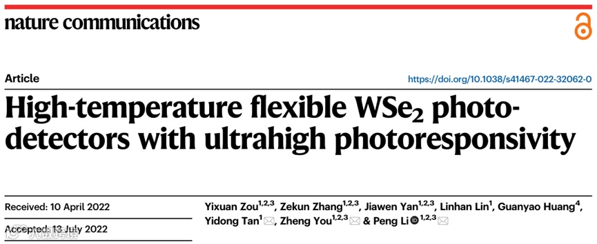 ”High-temperature flexible WSe2 photodetectors with ultrahigh photoresponsivity”,发表于《nature communications》,