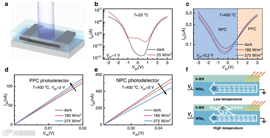 a.光照下的WSe2光电探测器的示意图;b. 20℃时白光照射下的转移曲线;c. 400℃时白光照射下的转移曲线,白色虚线用于区分NPC器件(蓝色区域)和PPC器件(橙色区域);d. 在400℃的白光照射下的Ids-Vds曲线,Vgs=3V;e. 在400 °C的照明下的Ids-Vds曲线,Vgs=0 V;f. 光学传感机制的示意图:在相对低的温度下,光激发的电子-空穴对负责产生光电流(过程1)。在高温下,电荷载流子有更多机会进入h-BN。被h-BN中的缺陷态困住的光生空穴充当了一个等效的正栅极偏压(过程2)。