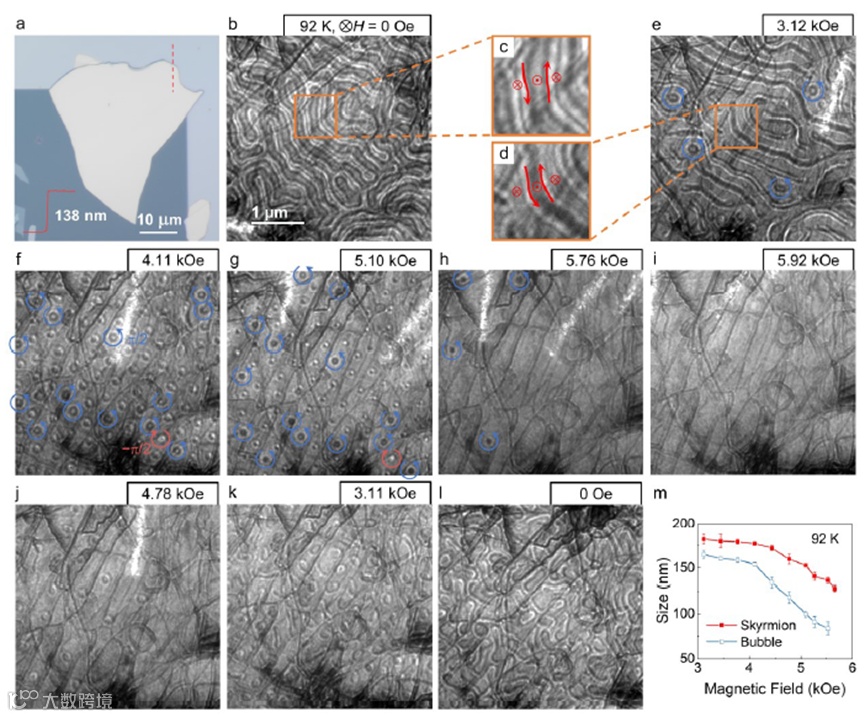 图5 a)约138 nm厚的F5GT薄片在氮化硅TEM窗格上的光学图像。红色实心曲线是用红色虚线标记的横截面的原子力显微镜高度剖面。b-i)增加磁场作用下的自旋织构演化。放大图像(c)和(d)中的红色箭头描绘了由平面内自旋形成的180°布洛赫畴壁的中心。(e-h)中的红色和蓝色圆圈分别表示螺旋度为 γ=−π/2和π/2的skyrmions。i-l)减小磁场作用下的自旋织构演化。磁场垂直于样品表面(ab平面)。样品没有倾斜,离焦值为−31um。m)气泡的大小与磁场增加的关系。