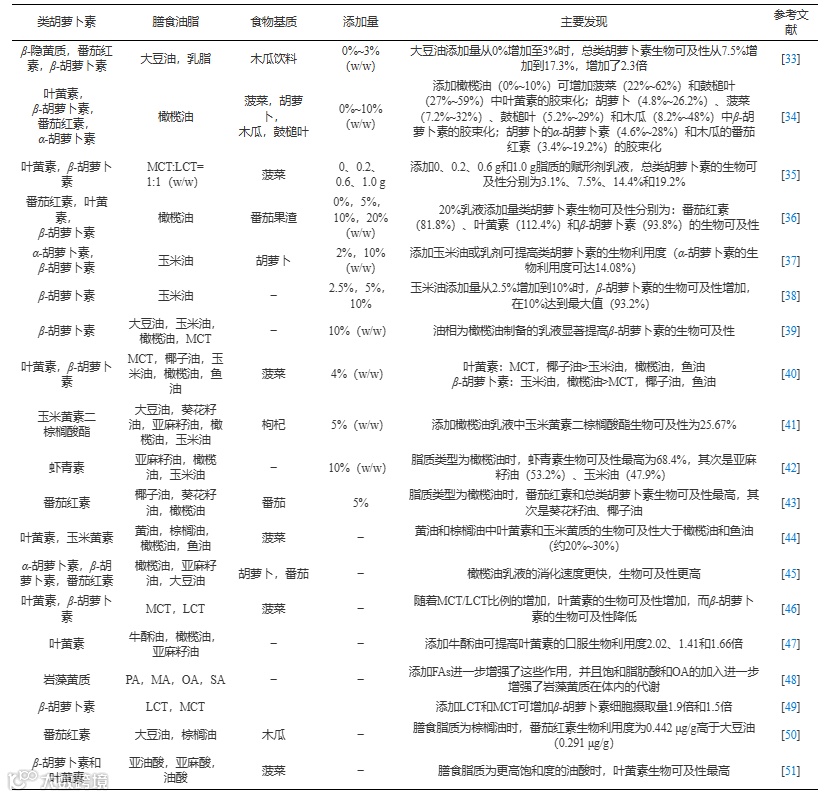表 1 膳食脂质对类胡萝卜素生物可及性和生物利用度的影响