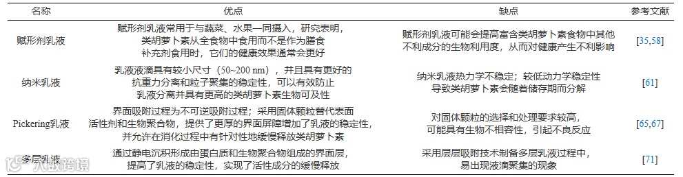 表 3 不同类型乳液递送类胡萝卜素优缺点分析