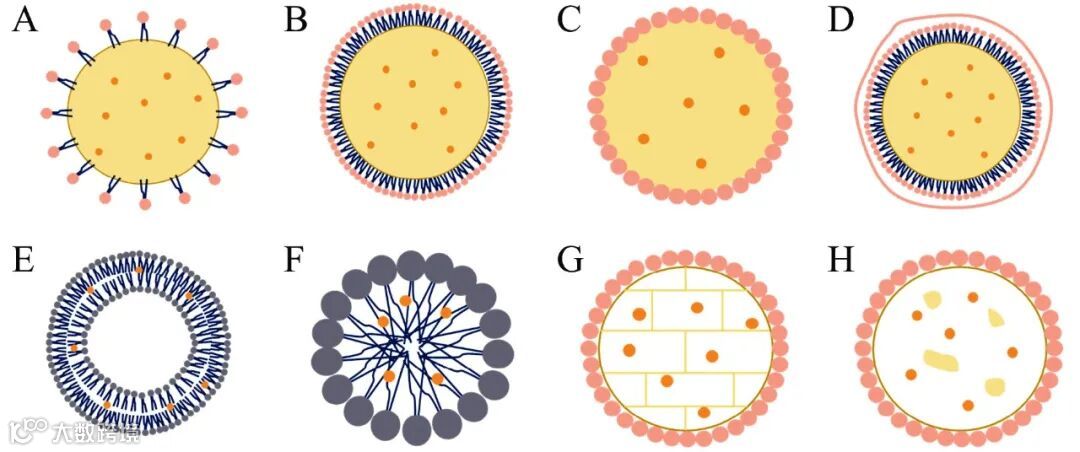 注:A:赋形剂乳液;B:纳米乳液;C:Pickering乳液;D:多层乳液;E:脂质体;F:胶束;G:固体脂质颗粒;H:纳米结构脂质载体。