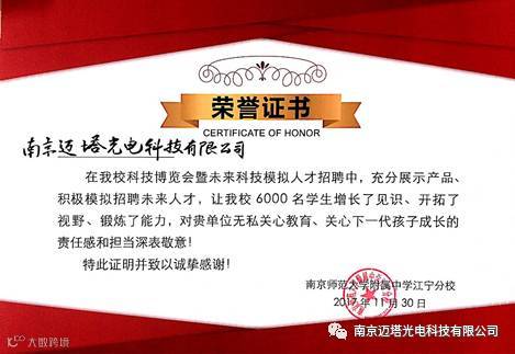 此次活动中由于热情的展示与耐心细致的讲解,迈塔光电展位人气居高不下,人群络绎不绝。在活动结束之际,南京迈塔光电有限公司也得到了校方的热忱感谢并颁发荣誉证书,借助此次活动让6000名师生有了一个增长实践知识,开拓物理视野的机会,也期待日后更多的合作。