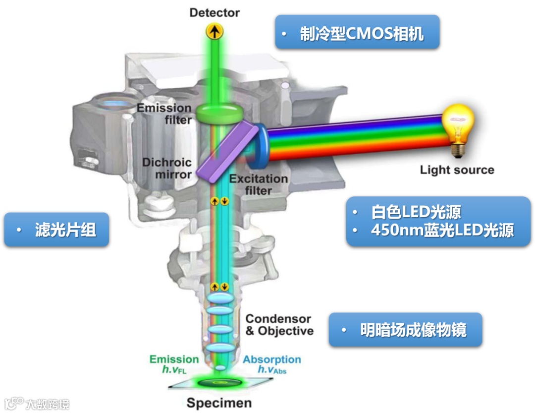 荧光观察是利用一定波长的光(通常是紫外光、蓝紫光)激发显微镜下标本内的荧光物质,使之发射荧光。E3-iEL采用大功率蓝光LED(450nm/385nm),蓝光通过分束器反射,通过物镜聚焦在样品表面。样品发射的荧光和反射光通过滤光片组后,反射光被滤光片组阻挡,荧光信号进入相机成像。相机采用的是荧光成像制冷显微相机,搭载830万像素高灵敏度CMOS传感器,可做到长时间曝光,曝光时间10ms—5min,拥有TE冷却结构,工作温度最低-10度。