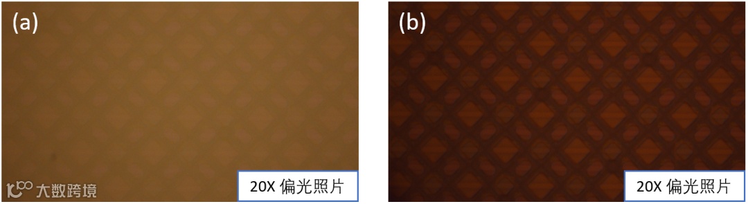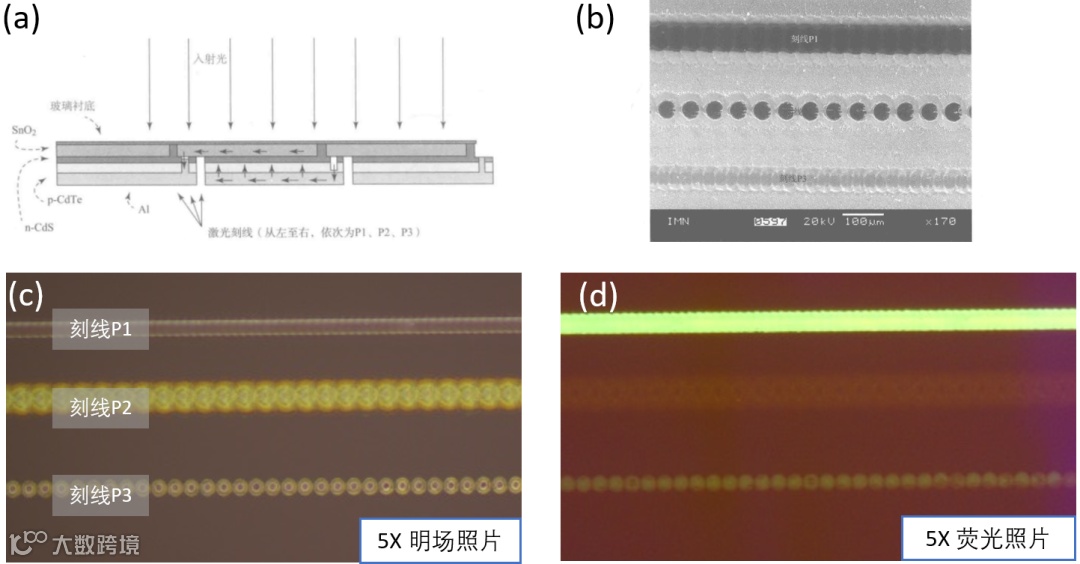 图6. CdTe碲化镉太阳能电池。(a)标准刻线方案[2];(b)刻线的扫描电镜[2];(c)5X物镜下的明场照片;(d)5X物镜下的荧光照片。