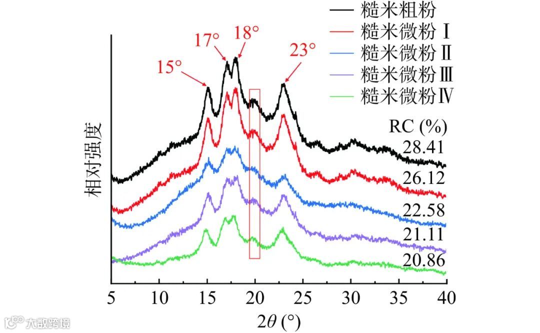 超微粉碎前后发芽-焙烤糙米粉的XRD衍射图谱结果如图4所示。由图4可知,发芽-焙烤糙米粉的XRD图谱在15°和23° 2θ处有两个单峰,在17°和18° 2θ处有一个不可分割的双峰,均表现出谷物淀粉典型的A型结晶结构,但结晶度由糙米粗粉的28.41%显著降低到糙米微粉IV的20.86%。