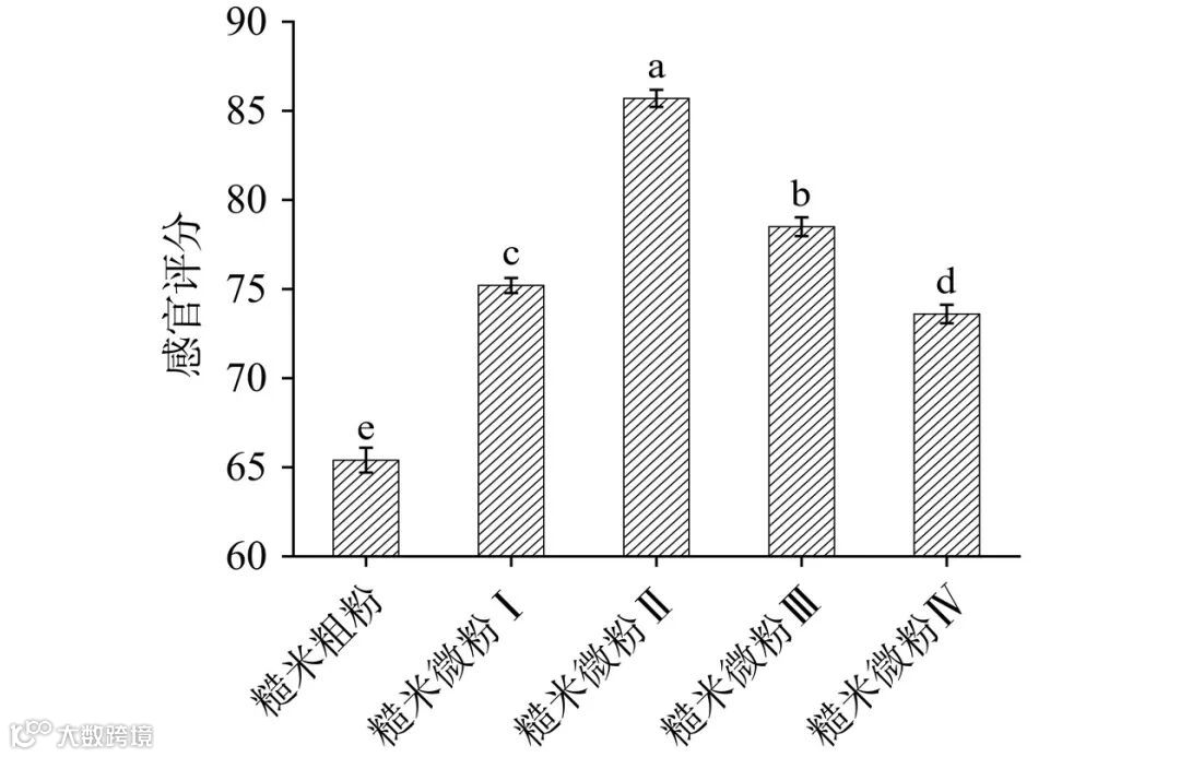 超微粉碎对发芽-焙烤糙米粉感官评价的影响如图6所示。感官评价通过人类感官系统对食品的外观、气味、口感、质地和风味等属性进行系统评估,从而提供消费者对产品接受度的直接反馈,不仅能够指导生产工艺的改进,还能帮助验证仪器分析结果的实际意义。由图6可知,随着超微粉碎时长的增加,糙米粉感官评分呈现先上升后下降的趋势。在超微粉碎时长为10 min时,糙米微粉的感官评分为85.7分,得分最高,可能是因为超微粉碎处理提升了粉体细腻程度,有效改善了冲调分散性,适中的吸水性确保了冲调后的适宜稠度,同时保持了较好的风味特性。当超微粉碎时长达到15~20 min,尽管糙米微粉III和IV粉体更细腻,水溶性与吸水性更好,但粉体粒径减小,比表面积增大,使得颗粒之间吸附和团聚作用提高,影响了发芽-焙烤糙米粉的分散时间与结块率。综上所述,超微粉碎时长为10 min的糙米微粉II在综合性能上更为均衡,避免了过度细腻可能带来的风味损失及结块率过高的问题,食用品质最佳。