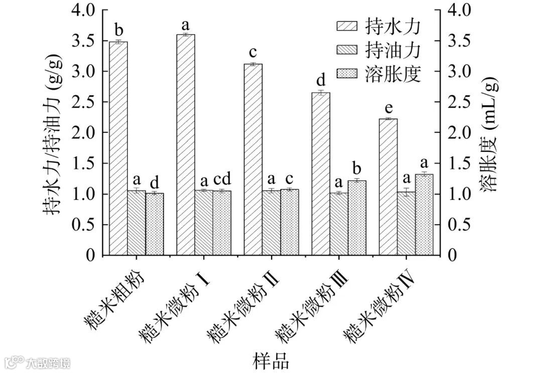 图 2 超微粉碎前后发芽-焙烤糙米粉的水合特性