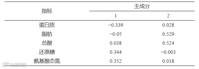 由表6可知,第一个因子方差贡献率为55.422%,第二因子的方差贡献率为36.026%,累计方差贡献率为91.449%。这两个因子可以代表理化指标的大部分数据信息,因此选取两个因子进行数据分析。