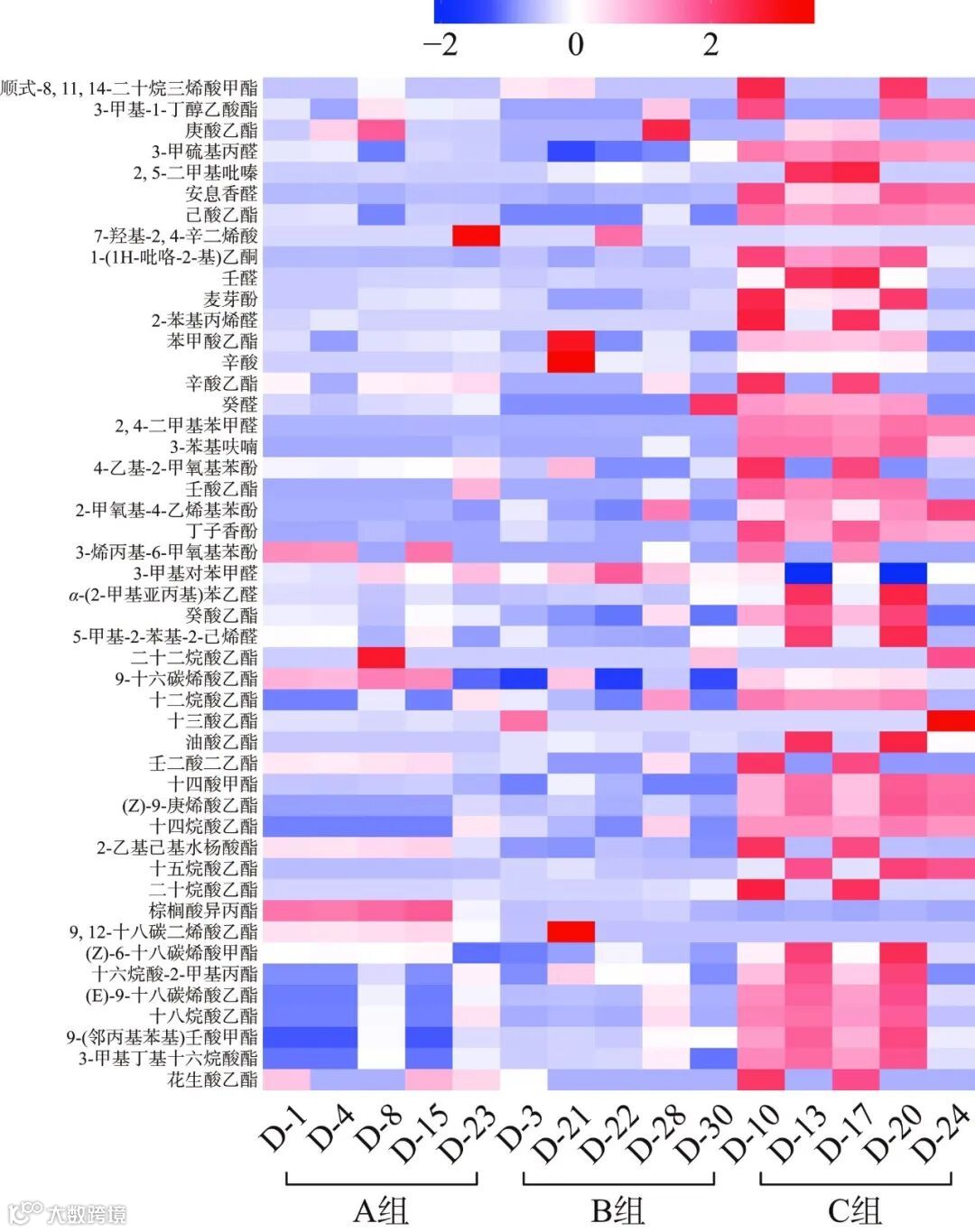 为了进一步了解区分三组豆酱的关键挥发物,选用三组豆酱共有的48种物质,对不同样本中所含同一化合物含量分别进行标准化处理后,绘制热图(图7),可以清楚的看出不同组别挥发性风味物质的相对含量。结果表明,三组豆酱样品互相对比,能明显看出C组豆酱的挥发性风味物质总含量更高。总体来看,48种挥发性风味物质分为:29种酯类化合物、9种醛类化合物、5种酚类化合物、2种酸类化合物、1种酮类化合物、2种其他类化合物。