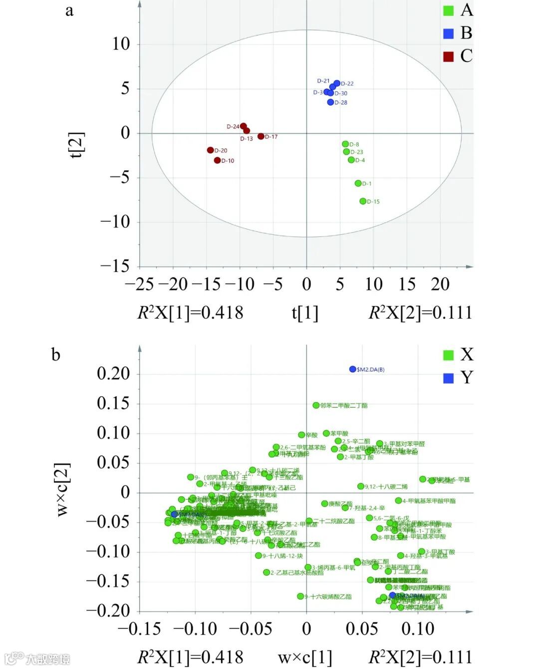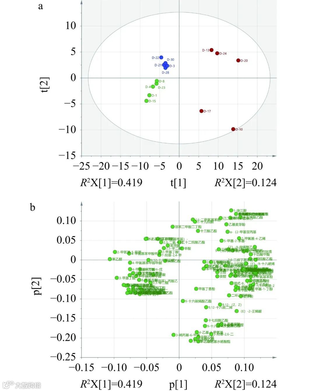 Figure 3. PLS-DA score (a) and load (b) of volatile flavor compounds in three groups of soybean paste