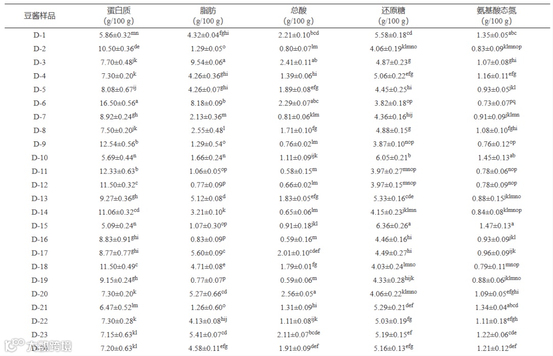 表 4 豆酱样品的理化指标测定结果(n=3)