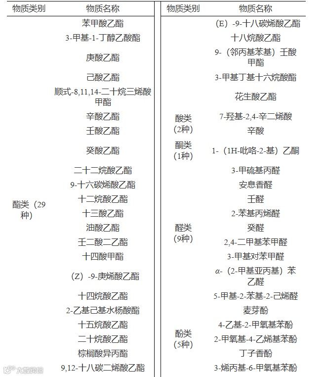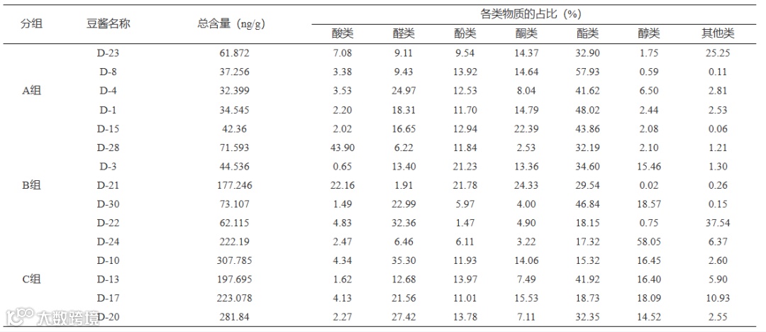 表 9 三组黄豆酱的主要风味物质类别及名称