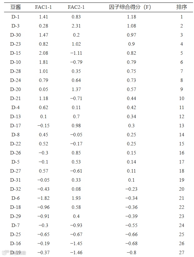 豆酱样品的因子综合得分如表8所示,主成分1主要代表变量为蛋白质、还原糖和氨基酸态氮,主成分2主要代表变量为脂肪和总酸。计算综合得分,发现不同豆酱样品的综合品质差异较大,选取因子综合得分前15名豆酱(D-1、D-30、D-23、D-3、D-10、D-28、D-15、D-20、D-21、D-24、D-13、D-17、D-8、D-22、D-4)进行后续分析。