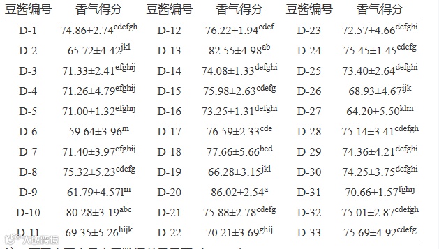如表3所示,33份豆酱的感官评分区间为59.64±3.96~86.02±2.54,香气得分最高的为D-20,最低的为D-6。基本属于香气一般及以上,但综合得分差异较大。可能是因为不同品牌豆酱的生产环境、原料和制作工艺上的差异。此外,张蕾蕾发现20种传统发酵郫县豆瓣酱的风味具有地域差异。而本研究的前五名豆酱为D-20、D-13、D-10、D-18、D-17,分别来自广东、辽宁、山东;后五名豆酱为D-19、D-2、D-27、D-9、D-6分别来自陕西、黑龙江、四川、辽宁、吉林。研究发现,与传统豆酱不同的是,不同市售豆酱的香气没有明显地域性差异。