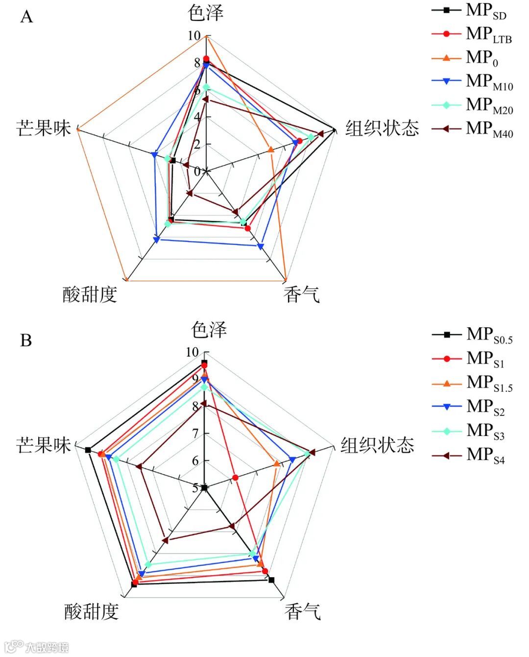 采用模糊综合判别法,对市售芒果粉及添加不同抗结剂制备的芒果粉进行感官评价,结果如图5所示。未添加抗结剂的纯芒果粉的色泽、香气、酸甜度、芒果味接近新鲜果肉,市售芒果粉MPSD的组织状态均匀分散,分别作为色泽、香气、酸甜度、芒果味、组织状态的评价标准。