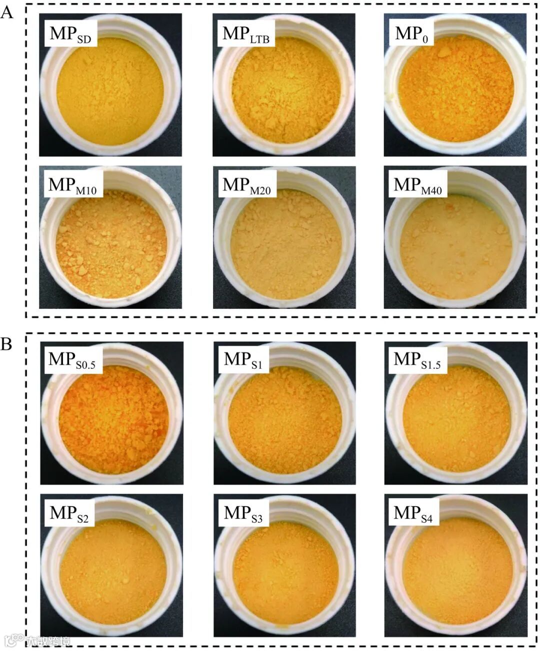 图 3 市售芒果粉及添加不同抗结剂制备芒果粉的外观形态