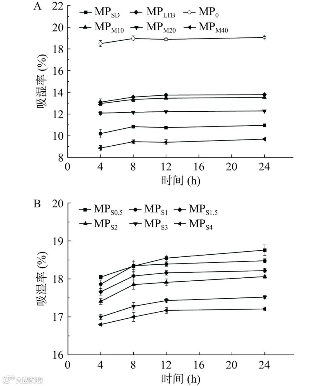 图 2 市售芒果粉及添加不同抗结剂制备芒果粉的吸湿率