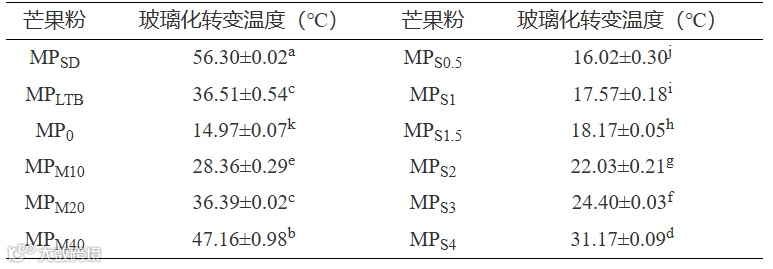 表 3 市售芒果粉及添加不同抗结剂制备芒果粉的玻璃化转变温度