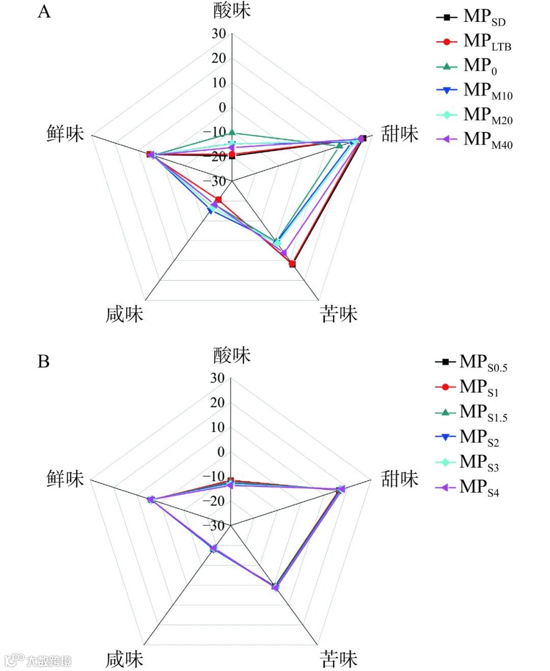 电子舌作为一种快速分析方法,可以客观地量化和准确分析芒果粉的味觉特征,目前已广泛应用于食品检测。使用电子舌对市售芒果粉及添加不同抗结剂制备的芒果粉的酸、甜、苦、咸、鲜五种风味进行考察,结果如图6所示。酸味值低于−13时口腔便无法感知,芒果粉MPSD、MPLTB、MPM10、MPM20、MPM40、MPS3、MPS4均感知不到酸味,而添加0.5%~2%大豆纤维的芒果粉的酸味值高于−13,达到可感知的程度。随着麦芽糊精、大豆纤维添加量的增加,甜味值上升,说明抗结剂对于芒果粉的甜味具有强化作用。添加0.5%~4%大豆纤维的芒果粉的甜味值分别为16.32、16.40、16.95、16.98、17.50、17.85,与纯芒果粉15.91相比,分别提高了0.41、0.49、1.04、1.07、1.59、1.94。苦味会限制芒果粉的应用,两款市售芒果粉MPSD、MPLTB的苦味值较高,分别为11.80、11.48,而添加麦芽糊精、大豆纤维的芒果粉的苦味值最高只有6.10、1.41。添加大豆纤维的芒果粉苦味值低,商品价值更高。鲜味值方面,未添加抗结剂的纯芒果粉的鲜味值为3.73,与纯芒果粉的鲜味值相差超过0.6,口腔能够感知到明显差异。两款市售芒果粉MPSD、MPLTB的鲜味值分别为5.13、5.10,可以感知到鲜味的提升。而添加麦芽糊精、大豆纤维的芒果粉的鲜味值范围依次为3.89~4.22、3.76~4.06,与纯芒果粉相比,鲜味没有明显差别。