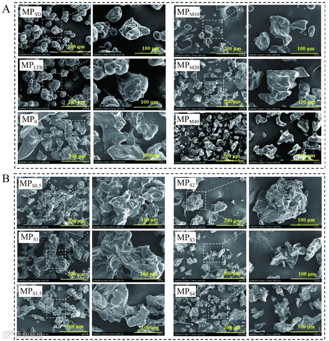 市售芒果粉及添加不同浓度抗结剂制备芒果粉的外观形态如图3所示,随着抗结剂添加量的增加,芒果粉更加细腻,分散程度接近市售芒果粉。两款市售芒果粉MPSD、MPLTB呈现均匀、分散的状态。而未添加抗结剂的纯芒果粉MP0粉末相互粘连,可以观察到明显结块,芒果粉的流动性降低。随着麦芽糊精添加量的增加,芒果粉中聚集块逐渐消失,直至麦芽糊精添加量为40%时,果粉中的聚集块基本消失;但芒果粉逐渐失去新鲜芒果的色泽,颜色偏白,可能是麦芽糊精添加量过高导致芒果粉纯度降低,说明芒果粉的色泽是本身有色成分带来。添加大豆纤维后,芒果粉的结块也得到了明显改善,随着大豆纤维添加量的增加,果粉更加细腻、分散。相比添加麦芽糊精的芒果粉,添加大豆纤维的芒果粉色泽更加明亮,接近新鲜芒果的橙黄色。大豆纤维添加量为3%~4%时,芒果粉均匀、细腻,未出现较大结块,与添加20%~40%麦芽糊精的芒果粉具有相同分散效果。