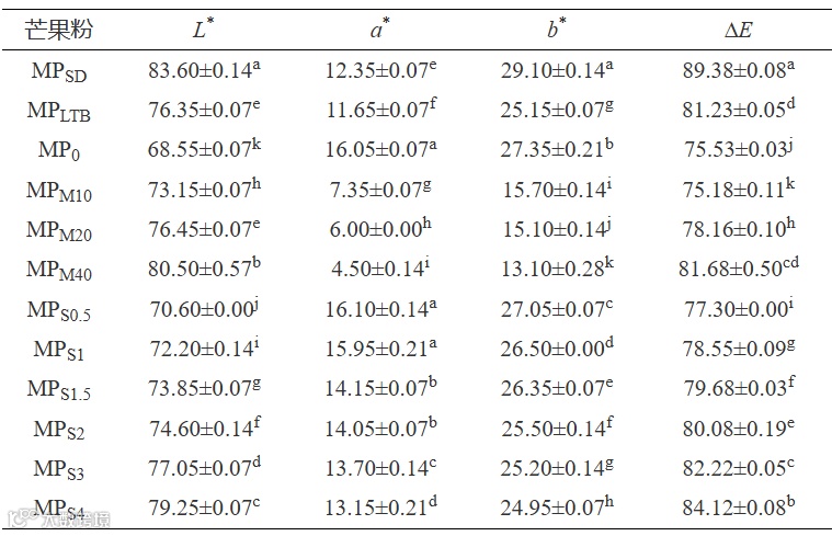 表 4 市售芒果粉及添加不同抗结剂制备芒果粉的色差