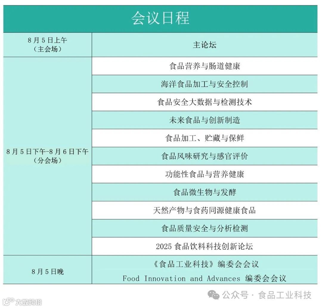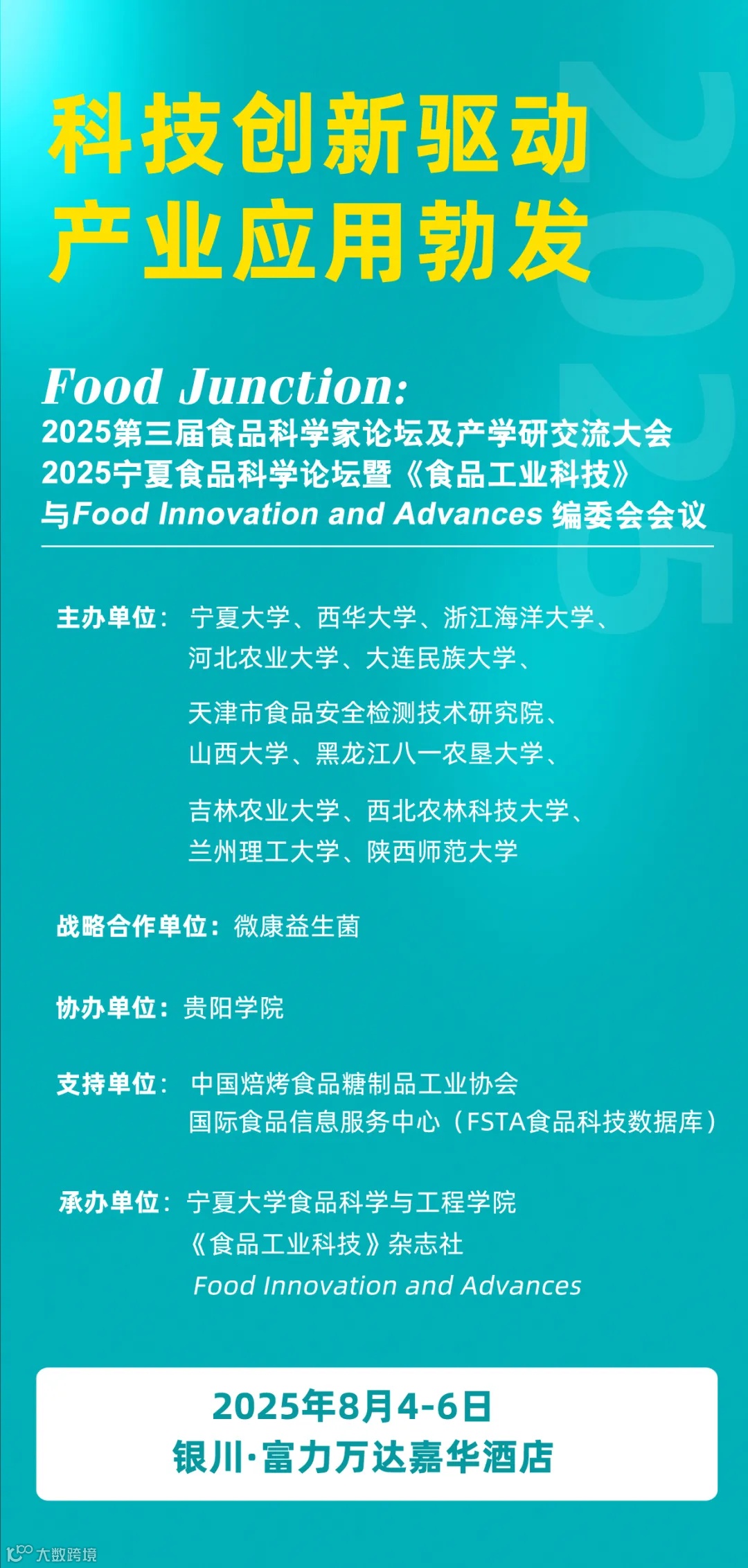 为推动食品科学领域的知识经验交流,促进食品产业的创新发展,2025第三届食品科学家论坛及产学研交流大会、2025宁夏食品科学论坛暨《食品工业科技》与 Food Innovation and Advances 编委会会议将于2025年8月4-6日在银川召开。本次论坛将以“科技创新驱动、产业应用勃发”为主题,旨在为食品科学家提供交流平台,加强技术交流和创新能力融合。