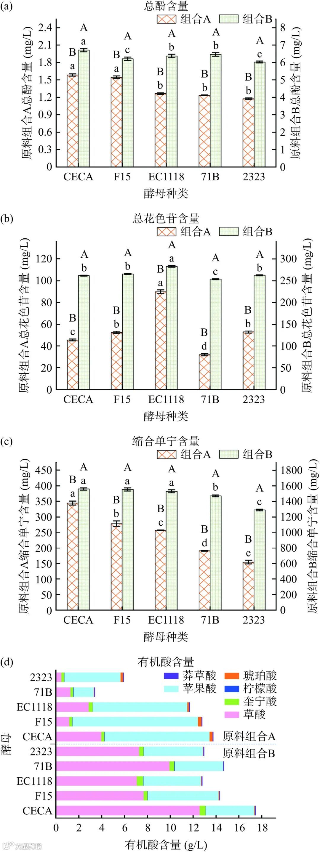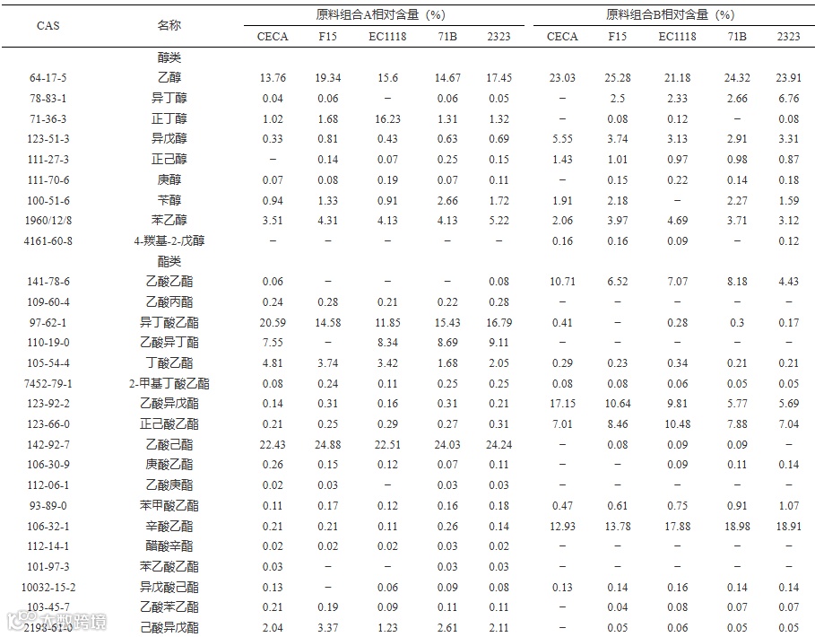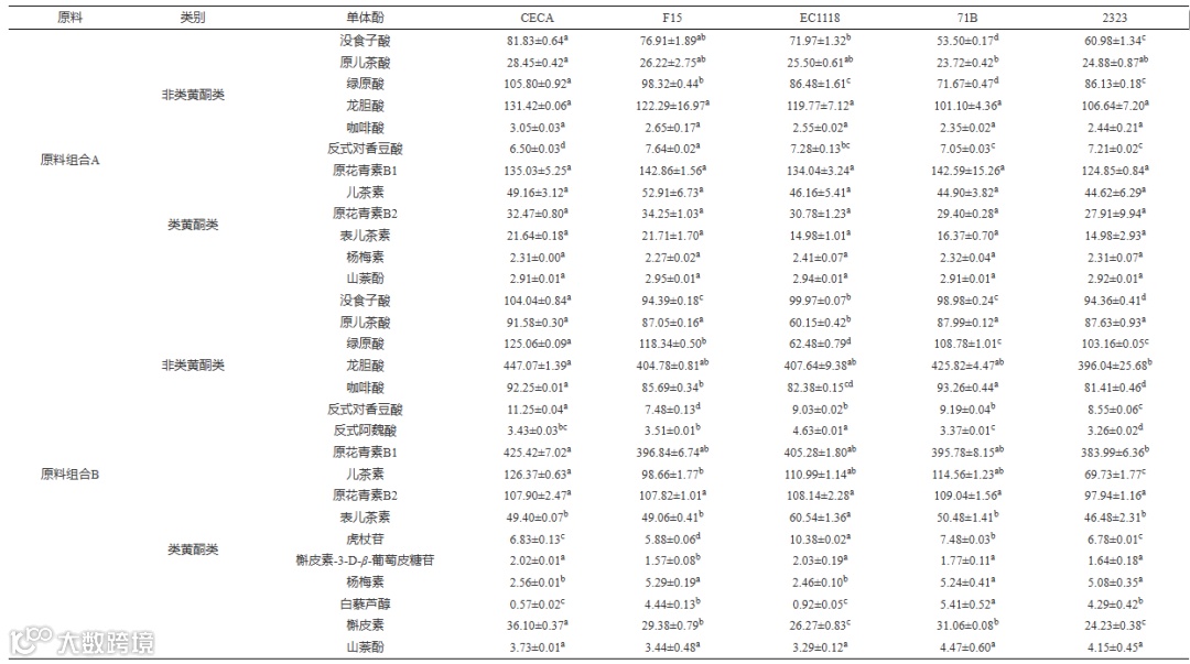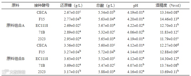 注:不同小写字母表示同一原料组合不同酵母之间的差异显著性(P<0.05),表3同。