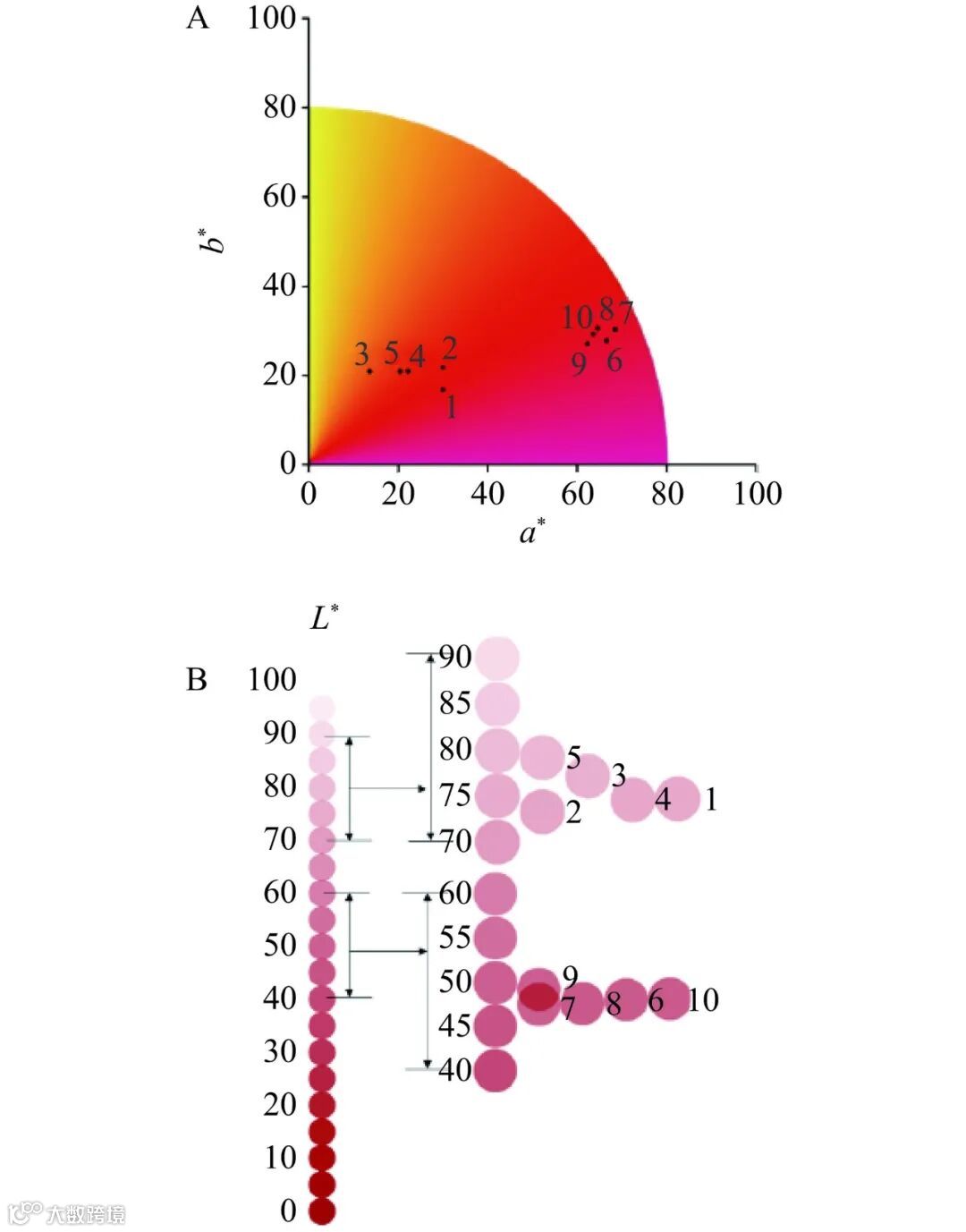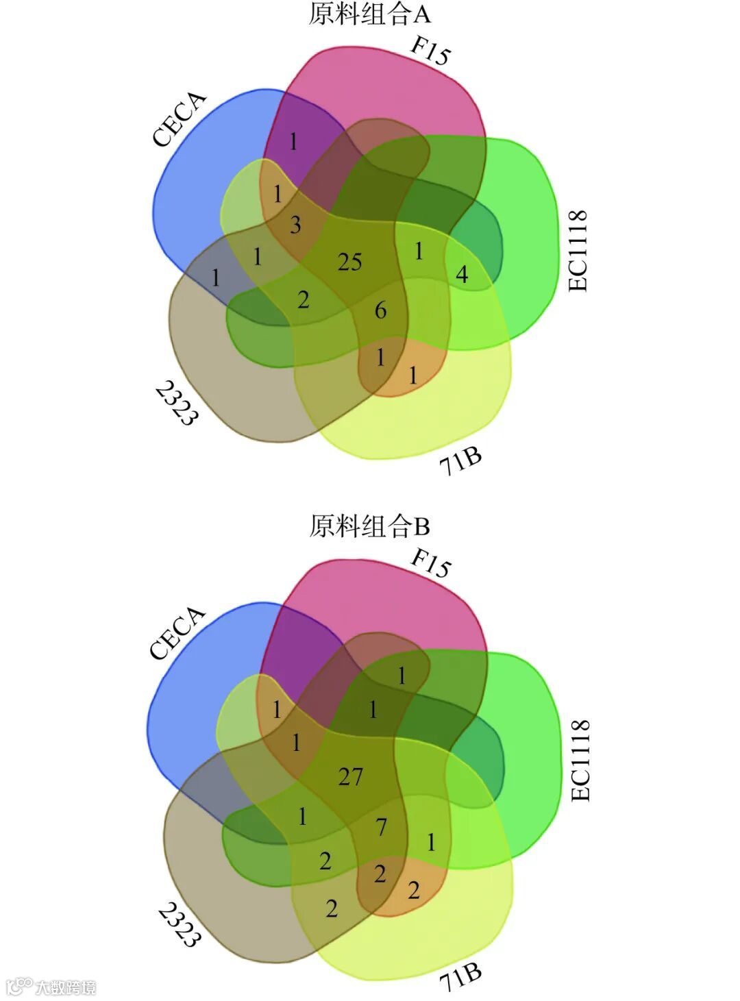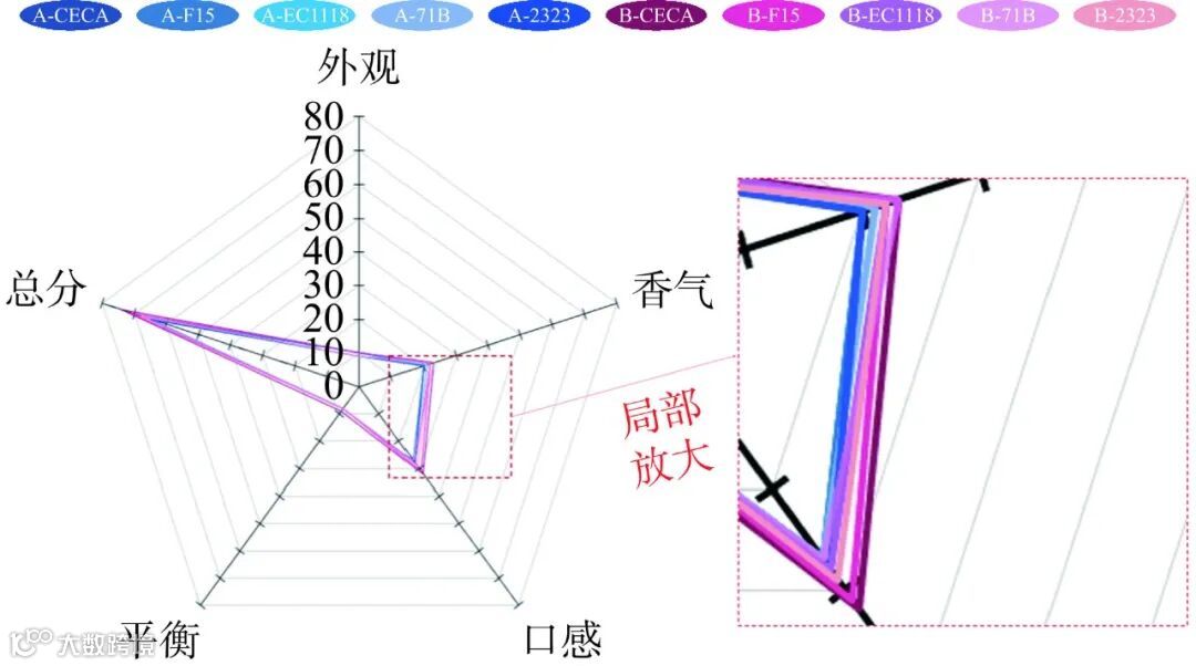 注:样品点1~5分别为原料组合A经由酵母CECA、EC1118、F15、71B、2323发酵的复合果酒;样品点6~10分别为原料组合B经由酵母CECA、EC1118、F15、71B、2323发酵的复合果酒。