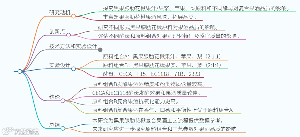 西北农林科技大学葡萄酒学院、神农智华生物科技(山西)有限公司、杨凌职业技术学院、西北农林科技大学食品学科与工程学院的王悦,张帆,王淑娟,薛雯,马婷婷、房玉林、孙翔宇等人主要介绍了黑果腺肋花楸的特性和应用,以及不同酿酒酵母对黑果腺肋花楸复合果酒品质影响的研究目的。主要包括以下几点:1. 黑果腺肋花楸原产于北美洲,具有丰富的营养成分和多种保健潜力。2. 黑果腺肋花楸果实味道酸涩,不适合鲜食,但适合加工成果酒等产品。3. 陕西地区苹果和梨资源丰富,可作为黑果腺肋花楸复合果酒的优质原料。4. 市面上黑果腺肋花楸果酒生产工艺尚不成熟,研发复合果酒有助于丰富风味和拓展品类。5. 研究选取了酵母EC1118、F15、71B、2323和我国本土酵母CECA,探究不同发酵剂和原料组合对果酒品质的影响。6. 研究采用多维度指标对果酒品质进行评价,旨在完善黑果腺肋花楸复合果酒工艺流程,为实际生产提供数据参考。