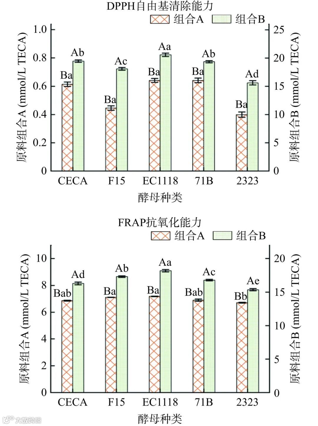 注:不同大写字母表示相同酵母发酵下不同原料黑果腺肋花楸复合果酒存在显著差异,P<0.05;不同小写字母表示不同酵母发酵下相同原料黑果腺肋花楸复合果酒之间存在显著差异,P<0.05,图2同。