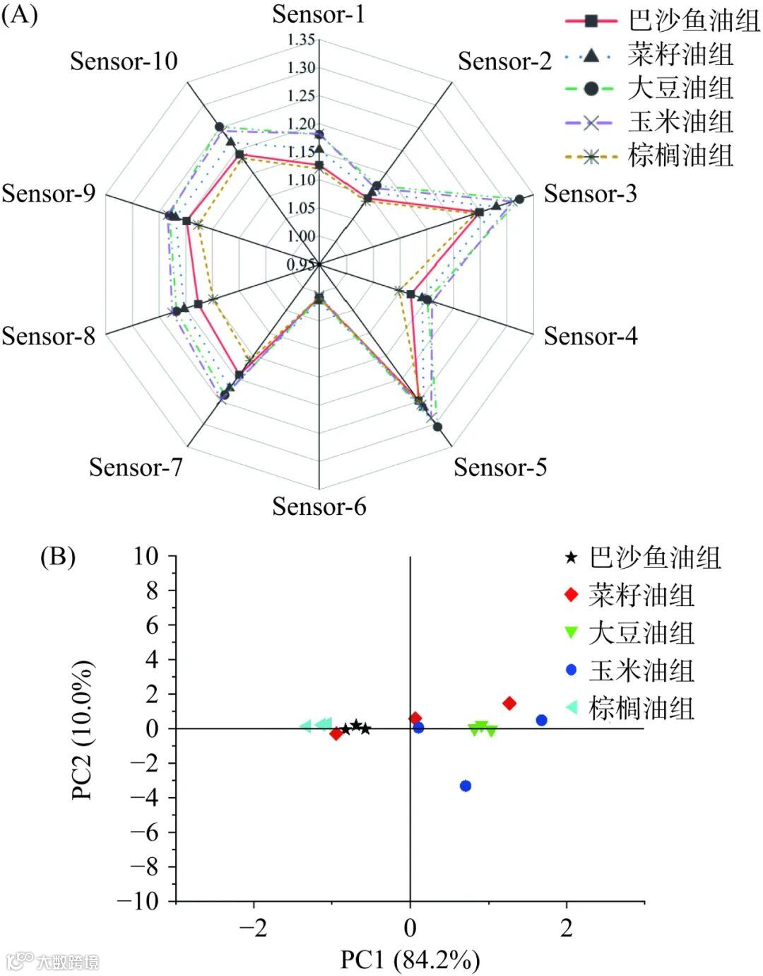 Fig.2 Electronic nose radar map (A) and PCA diagram (B) of five cooking oil fried samples