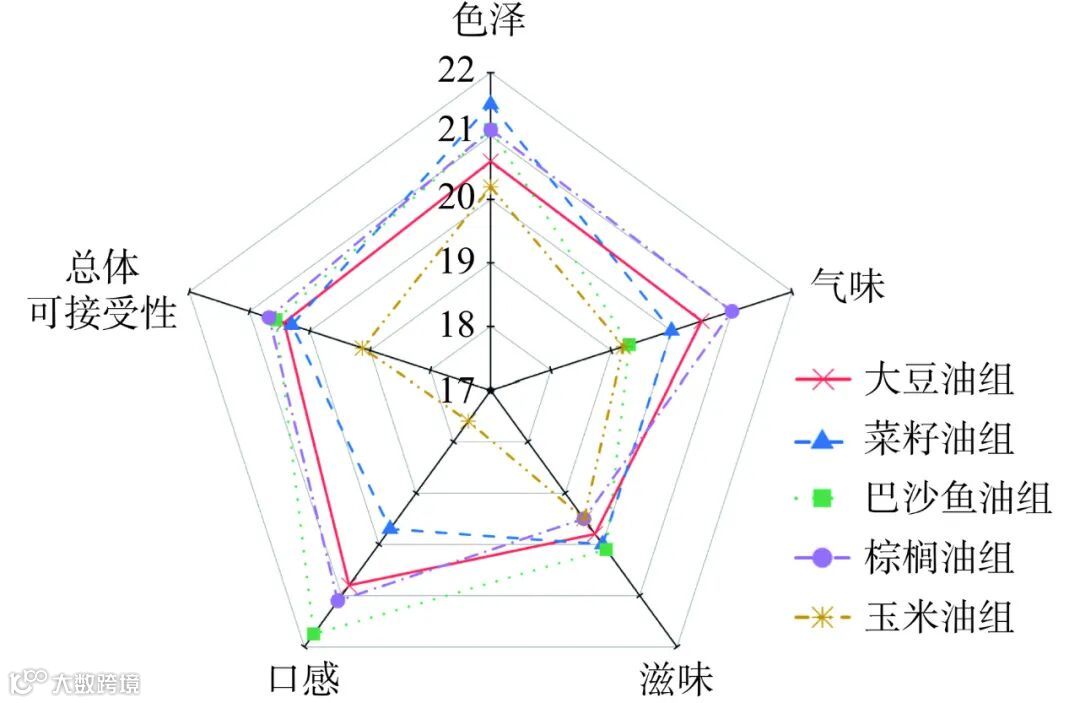 Fig.1 Radar chart of sensory scoring for five groups of cooking oil fried samples
