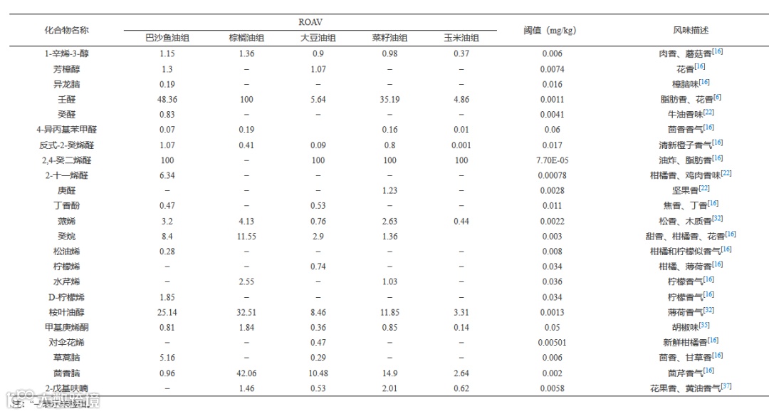 Table 4 Composition of volatile flavor components in five groups of cooking oil fried samples