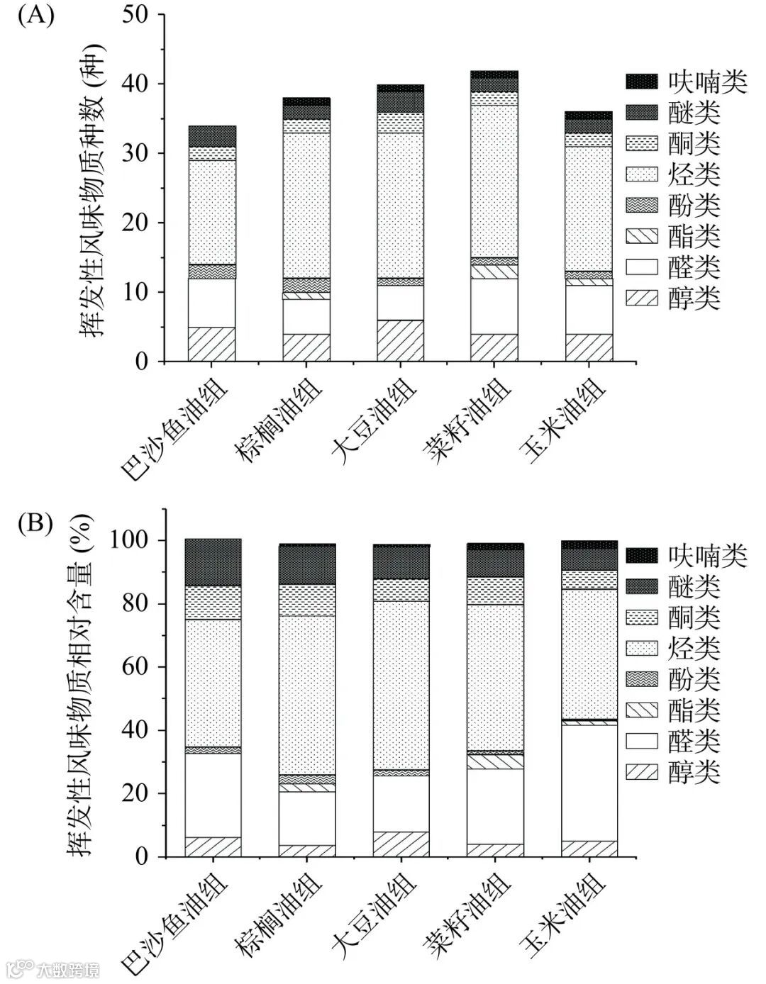 图 3 五种食用油油炸样品的挥发性风味物质种数(A)和相对含量(B)