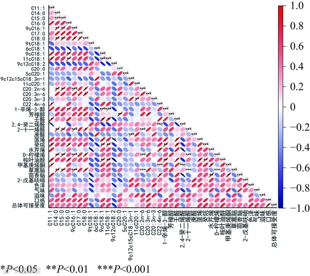 Fig.6 Heat map for correlation analysis of fatty acid composition, sensory score, and volatile flavor components